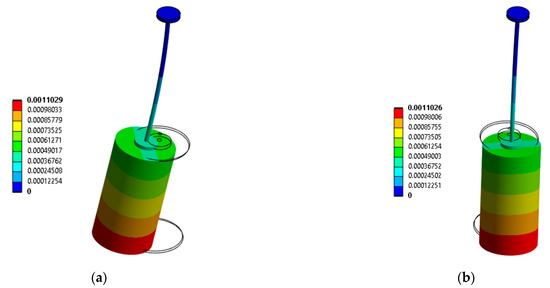 where and are the acoustic and structural mass matrices, and are the acoustic and structural damping matrices, and are the acoustic and structural stiffness matrices, is a coupling matrix, and is the structural displacement which is equal to at the fluid–structure interface. Solving Equation (26) coupled with Equation (27), the natural frequencies and mode shapes of bodies submerged in a fluid taking into consideration the added mass effects can be computed.