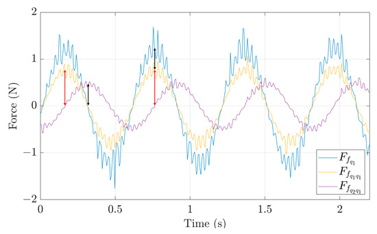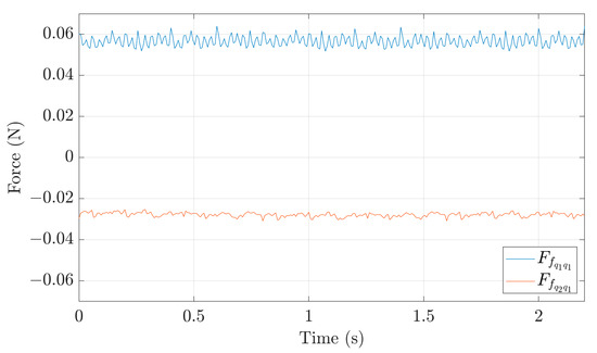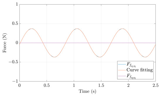 As shown qualitatively by the black and red arrows in Figure 3, the sine amplitude of is approximately equal to the sine amplitude of plus the absolute value of the cosine amplitude of . Using the curve-fitting algorithm, the sine coefficient of can be calculated and is 1.23 N. Similarly, the sine coefficient of and the absolute value of the cosine coefficient of can also be calculated and are 0.7563 and N, respectively, which when added give a value of about 1.2364 N showing a deviation of 0.5% relative to the actual amplitude, calculated using the full whirling motion. Thus, it is verified that the simplification is approximately valid.