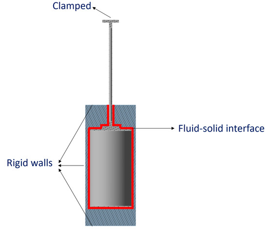 Among all the parts of the test rig, only the slim shaft and the cylinder were included in the acoustic-structural model since the mode shapes of interest only affected this region, as shown in Figure 1 where it is observed that the top of the slim shaft presents zero displacement. The material of the shaft and the cylinder was considered a standard stainless steel. The acoustic domain was modeled as water with a density and speed of sound of 1000 kg/m3 and 1430 m/s, respectively. Showing the boundary conditions in Figure 5, it can be seen that: (i) the top of the shaft was considered as clamped, (ii) the top and bottom covers as well as the lateral walls of the cylindrical water tank were considered rigid walls, and (iii) the nodes of the solid elements in contact with the fluid were considered as part of a fluid–solid interface.