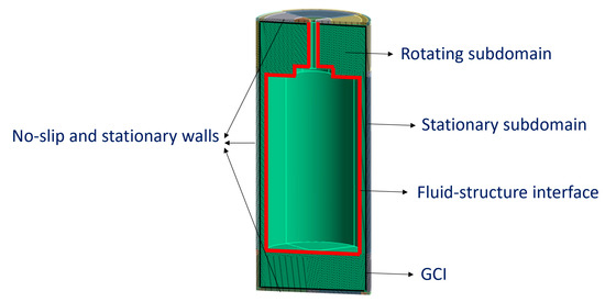The CFD domain was modeled using the water material defined in Section 2.1.1. Showing the boundary conditions in Figure 7, it can be seen that: (i) the top and bottom covers as well as the lateral walls of the cylindrical water tank were defined as stationary no-slip walls, (ii) the fluid–structure interface was also defined as a no-slip wall but it was forced to oscillate periodically according to , and (iii) under rotating conditions, the rotating subdomain was also forced to rotate whilst a general connection interface (GCI) was used to join both subdomains.