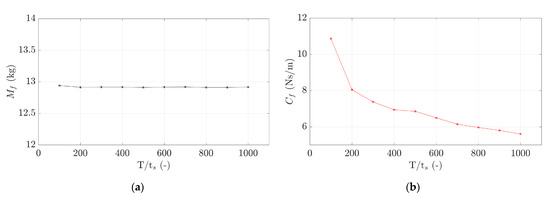 Figure 9 presents the results of a sensitivity study of the time step, ts, to obtain an independent model. and are plotted as a function of the number of time steps per vibration period, T, through T/ts. It is observed that presents the same value for all ts; however, decreases when ts is decreased.
