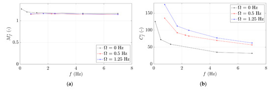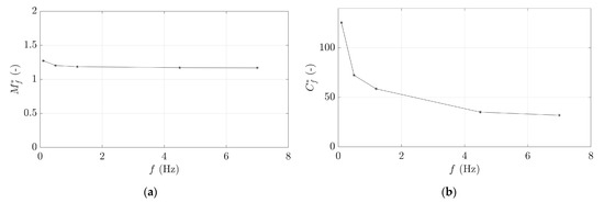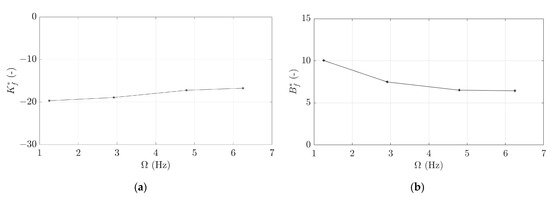 Figure 12 shows the evolution of and as a function of . presents a constant value when is higher than 1 Hz, which agrees with previous studies that concluded that was independent of the flow conditions and [10,22,23,24]. However, for lower than 1 Hz, the increases when is decreased, as was also observed in a previous investigation with Kaplan turbines [25].