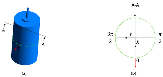Figure 14a shows an isometric view of the cylinder with a green line over the perimeter located at the midplane. The red arrow indicates the direction and sense of the vibration at time instants, corresponding to the maximum amplitude of the oscillation, and , corresponding to the zero oscillating amplitude. It must be noted that at , the cylinder presents the maximum and but a m/s. On the other hand, at , the cylinder presents the maximum but a m/s2 and a m. Consequently, at and the added modal forces are induced exclusively by and , respectively. Figure 14b shows the locations on the green perimeter corresponding to the axis of Figure 15 and Figure 16, with corresponding to the front of the cylinder and to the back of the cylinder.