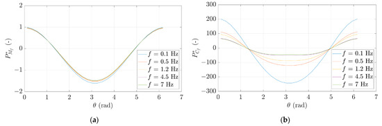 At , both and present the highest value as shown in Figure 15a,b. and decrease and become negative when moving along the perimeter in the counter-clockwise direction. At , and show the lowest pressure and then increase progressively when moving towards to the front of the cylinder. It must be noted that lower results in higher and and that at higher values of , they tend to present the same amplitudes regardless of .