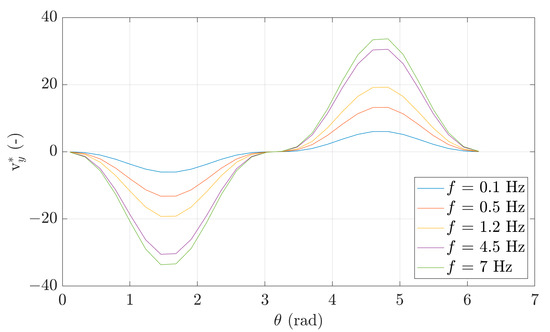 As shown in Figure 16, at , and then decreases and becomes negative moving over the perimeter in the counter-clockwise direction, reaching the lowest value at . Subsequently, increases progressively up to 0 at , then continues increasing and presents the highest value at . Finally, decreases moving towards to the front of the cylinder. It must be noted that lower values of result in lower and that at higher values of , it tends to present the same amplitudes regardless of .
