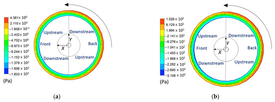 Pressure distribution on the midplane of the cylinder when and . The black arrow indicates the rotating direction.