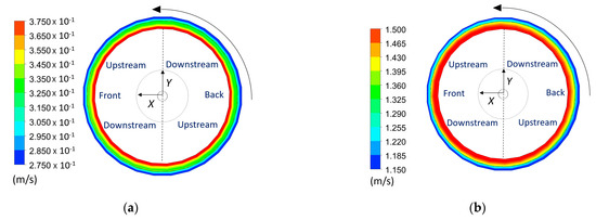 Figure 17 and Figure 18 show the distributions of the pressure and velocity, respectively, on the midplane of the cylindrical water tank when and . Under these circumstances, the cylinder is displaced, according to the scaled by , and it does not oscillate but only rotates. The lowest pressure occurs downstream close after the front of the cylinder and the highest pressure occurs downstream close after the back of the cylinder. This pressure distribution is due to the fact that the fluid thickness is smaller at the front of the cylinder than at the back, leading to higher flow velocities at the front and, consequently, a lower pressure.