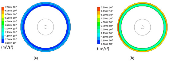presents a linear increase when or increase regardless of the values of or (see Figure 21b and Figure 22b). The rotating flow does not alter the trend of , increasing linearly in general as a function of . However, the rotation alters the exact value of , with higher values of resulting in a higher damping. Assuming that the flow velocity passing over a non-rotating structure is equivalent to the flow induced by a rotating structure, these results agree with previous authors who observed that increased linearly when the flow velocity passing over a vibrating non-rotating structure increased [9,21,23,26]. It can be seen that, in general, increases faster when increases than when increases. Figure 23 presents the turbulence kinetic energy on the midplane of the cylindrical water tank when is 7 Hz and is 0.5 and 1.25 Hz at . Although the flow presents a low degree of turbulence, its increment at higher values of will result in higher VFs and a new pressure distribution that may also contribute to the damping increase.
