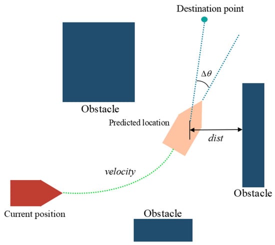 where , , and are weighting coefficients; is the azimuth evaluation function; is the obstacle distance evaluation function; and is the speed evaluation function. is used to calculate the USV orientation score. During the movement of the USV, was used to drive the USV toward the target point. As decreases, the angle between the bow of USV and target point decreases. Meanwhile, the increase in the value of the function increases . The schematic of the DWA algorithm is shown in Figure 3.