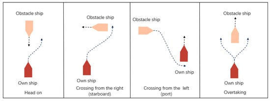 There are four main types of collision avoidance scenarios in COLREGs, namely head-on situation, crossing from the starboard side, crossing from the port side, and overtaking situation, as shown in Figure 4. The head-on case occurs when our ship and the target ship are moving head-on, that is, our ship and the target ship are traveling on an almost overlapping course. In this scenario, both our ship and the target ship should change their course to starboard to allow our ship to pass on the port side of the target ship (Rule 14), thereby ensuring safe navigation. The second and third scenarios are crossing situations, which are divided into the obstacle ships approaching from the starboard or port. When two ships are in a crossing situation, if the target ship is approaching from the starboard side of our ship, our ship should make way for the target ship and try to avoid crossing in front of the target ship (Rule 15), i.e., the second situation. When the target ship is approaching from the port side of our ship, our ship should maintain the original course and speed, i.e., the third case. The fourth scenario is an overtaking situation, where any overtaking ship shall avoid the ship being overtaken (Rule 13). If our ship is being overtaken, the original course and speed should be maintained.