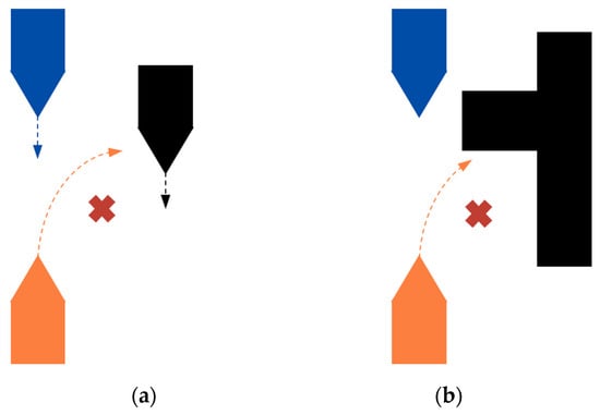 Examples of special ship encounters. (a) Presence of other dynamic obstacles on the starboard side of the vessel in head-on situations. (b) Presence of other static obstacles on the starboard side of the vessel in head-on situations.