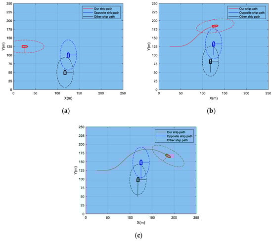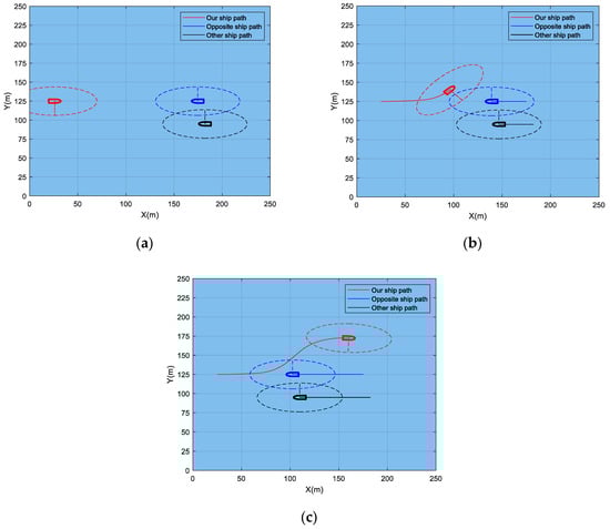CCDWA algorithm for emergency collision avoidance in the crossing situation. (a) Starting position of collision avoidance. (b) Start avoiding collisions. (c) End of collision avoidance.