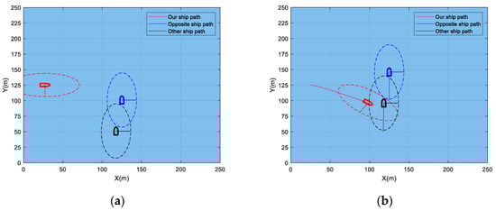 As shown in Figure 6a, the target ship maintains its direction and speed, and there is a ship traveling head-on on the port side of the target ship. As such, if our ship steers toward the starboard side in accordance with the CCDWA algorithm, it may be very dangerous and can even lead to collision. As shown in Figure 6b, there is a stationary obstacle exactly on the port side of the target ship. If our ship steers toward the starboard side, it will be in danger or even result in collision. Therefore, the optimal choice for our ship in this situation should be to turn starboard as far as possible, and if the target ship has no intention of avoiding, our ship could quickly turn to the port side to avoid collision.