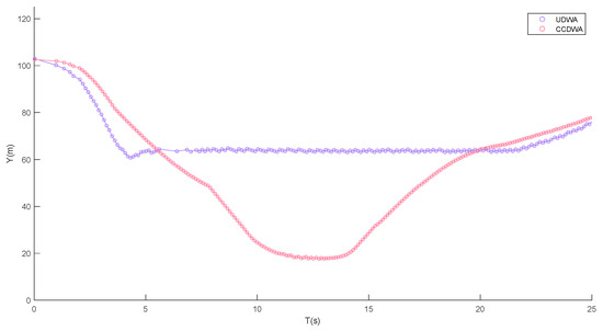 Figure 10 shows the comparison of the distance between our ship and the nearest obstacle ship using the CCDWA and UDWA algorithms. As shown in the figure, the initial distance between the ships is equal, and the distance decreases until 12 s when the USVs are traveling toward the encounter scenario. As such, the collision avoidance behavior starts at 12 s, where the closest distance between the USVs using the CCDWA algorithm is 33.56 m, and the average distance is 54.80 m, whereas the closest distance between the USVs using the UDWA algorithm is 59.48 m, and the average distance is 78.50 m. As such, the collision avoidance ended, our ship moved from the remaining obstacle ship, and the distance increased.