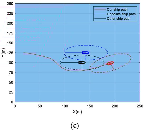 Figure 8 shows the simulation of the emergency collision avoidance scenario of the CCDWA algorithm for the head-on situation; the red ship in the figure is our USV, the blue ship is the head-on USV, the black ship is the other USV causing the emergency collision avoidance scenario, and the dashed ellipse area is the ship domain of the corresponding ship, which is seven times the length of ship on the long axis and thrice the length of ship on the short axis.