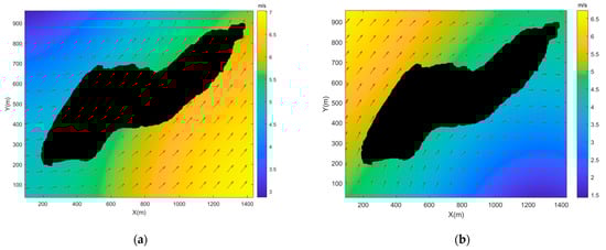 For the validation of the algorithm for navigating in windy and wavy environments, the waters around the Ikaria island were used in the simulation environment, as shown in Figure 17. Two sea-breeze conditions are simulated in this study to verify the effectiveness of navigating in windy and wavy environments, namely a higher wind speed in the south and lower wind speeds in the north, as shown in Figure 18a, and a higher wind speed in the north and lower wind speed in the south, as shown in Figure 18b. The wind and waves move faster in the warm-colored areas and slower in the cool-colored areas. The red arrows show the direction of the wind and waves.