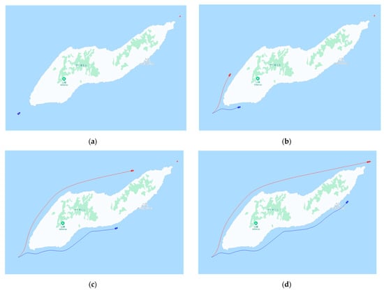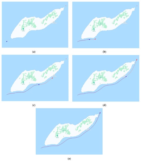 As shown in Figure 21b–e, the USV can flexibly follow the COLREGs Rule 2 when facing emergency collision avoidance in the encounter scenario, whereby it should not follow the COLREGs to navigate safely and avoid collision, if necessary. In this case, collision avoidance can be accomplished by steering to the port side. Moreover, in the windy and wavy environment shown in Figure 18a, the USV traveled on the south side of the water to verify the validity of the USV considering the windy and wavy environment.