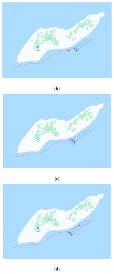 Figure 14 shows the emergency collision avoidance operation of the CCDWA algorithm in the overtaking situations. The port-side speed region () is excluded; that is, the ship can only steer to the starboard side. After the pursuit of the blue ship, the red ship is forced to continue to steer on the starboard side due to the presence of the black ship, as shown in Figure 14b. Owing to the limitation of the motion model, consecutive steering on the starboard side allows the red ship to easily enter the domain of the other ships, as shown in Figure 14b. Although successful collision avoidance could be achieved, the extremely small distance between the ships poses a risk.