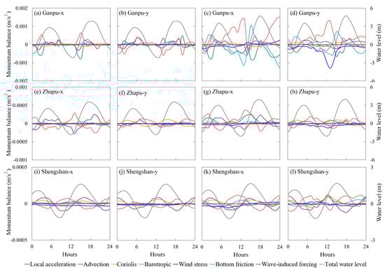 Station | Scenario | Local Acceleration (In x/y Direction) | Advection (In x/y Direction) | Coriolis (In x/y Direction) | Barotropic (In x/y Direction) | Wind Stress (In x/y Direction) | Friction (In x/y Direction) | Wave Forcing (In x/y Direction) |