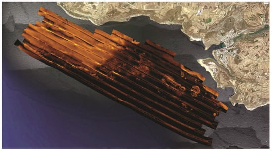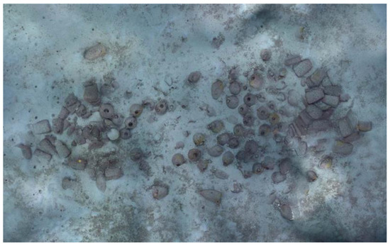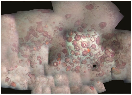 A sub-bottom profile survey carried out a year later revealed the presence of buried material, which enabled the planning of ROV surveys in 2009 that conclusively defined the nature of the anomaly. The resulting survey gathered several minutes of video footage and general photographs that “permitted the final confirmation that the anomaly was indeed an ancient shipwreck” [10] (p. 75). The presence of mixed cargo consisting of amphorae and saddle querns that correspond to the rounded and rectangular objects first revealed in the high-frequency sonar survey were datable to the 7th century BC. This confirmed the site as an archaic wreck, and to date, it is the oldest known shipwreck in the central Mediterranean. The ROV-captured photographs were used to create a photomosaic of the site, but a consistent lack of vessel stability on the surface meant that the lines of the ROV were executed manually. Whilst the resulting quality was not of scientific standard, it was suitable for planning purposes and allowed researchers to see the site in its entirety (Figure 4) [10].