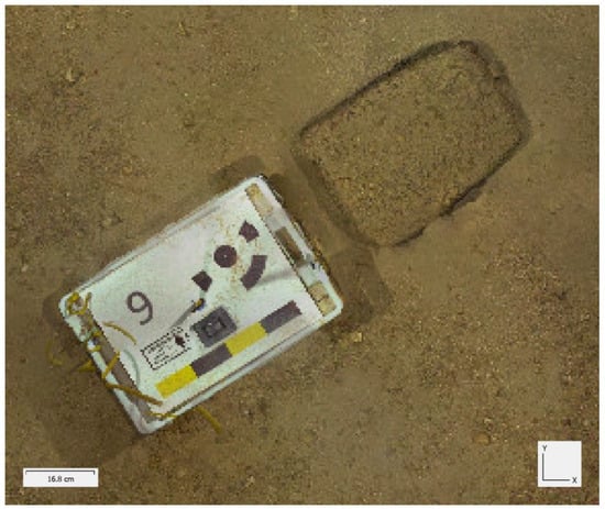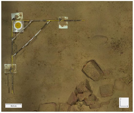 In addition, to accurately capture the inclination of the plane from a Z-axis perspective, a 2 m by 2 m reference measuring square was carefully positioned in a perfectly horizontal manner at the excavation site. This was achieved using a bullseye level and adjustable legs placed on ceramic tiles to ensure stability (Figure 7). This scale provided a set of marked reference local coordinates ({0,0,0/0,2000,0/2000,0,0}) to facilitate precise measurements of the plane’s inclination during data capture. Once the local coordinate system was established with reference to the six control points, the level square was no longer required, and removed. However, the scale bars were retained to serve as control measurements for the models.