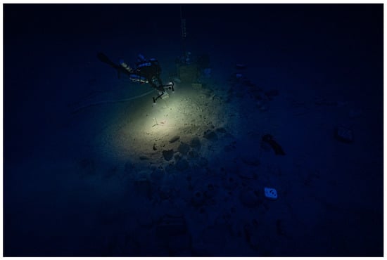Therefore, when it comes to underwater cultural heritage, preservation in situ is often also the preferred approach from an economic perspective, and intrusive techniques are only justifiable when a site is under threat or when visual surveys have reached the limit of what is discernible. These variables are often coupled with the rarity or uniqueness of a site, and excavation is planned only if all these elements align [15,16,17]. In the case of the Phoenician shipwreck, the sparsity of similar sites in the Mediterranean provided a legitimate foundation for the planning of an archaeological excavation. The initial fieldwork seasons provided a solid foundation on which an excavation could be planned, and the analysis of the visible elements of the cargo and the sub-bottom profile data all hinted at the potential of significant material and information being buried beneath the main cargo. Based on this, a decision was taken to conduct an excavation using specialised technical divers, and between 2018 and 2021, the first scientific excavation at a depth of 110 m was successfully concluded.