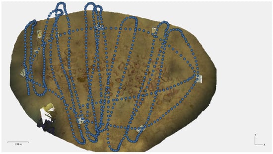 A typical scan of the entire site is composed of approximately 2500 photographs, including a ‘boundary’ of the site which ensures coverage of the six control targets (Figure 9). Due to the limited time on site, two separate dives were required to capture data for the complete site. The flypath for the complete site was carried out in two parts. The first path traversed the complete perimeter of the site, using the coded targets as the visual reference points. The second part involved running transects across the width of the site, again using the coded blocks as visual markers. Full coverage was ensured by allowing for a sufficient buffer for parallel tracks to overlap, relying mainly on the experience of the individuals gathering the data to travel at a relatively consistent distance from the seabed to achieve the required overlap. In respect to the complete site, most images were captured at a nadiral orientation to the site; however, the camera operator also used angled orientation to increase the robustness of the data. Some vertical data was also captured due to the wide-angle lens (12–14 mm) that was typically used. This allowed for substantial non-horizontal data to also be captured. When it came to the daily recording of the excavation trench, an angled orientation was included to capture the sections of the trench. During the final season in 2021, scooter-mounted cameras were deployed, thus permitting data capture to be completed in a single dive. The scooters were run at approximately 30 m per min or 0.5 m per second, and images were captured at an interval of 0.8 s, at a height of 1.5 m to 2.5 m off the seabed. This was calculated to provide substantially more than the required overlap of 80%, allowing for a sufficient margin of error in the case of faster or closer runs than planned.