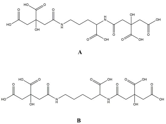 Our derivative has the same portion of α-hydroxy carboxylate (two units of citric acid), but it differs for the linker between the two citric units, respectively 2,5-diaminopentaenoic acid for staphyloferrin A and 2,6-diaminohexanoic acid for our molecule (see Figure 1 for comparison of the chemical structures).