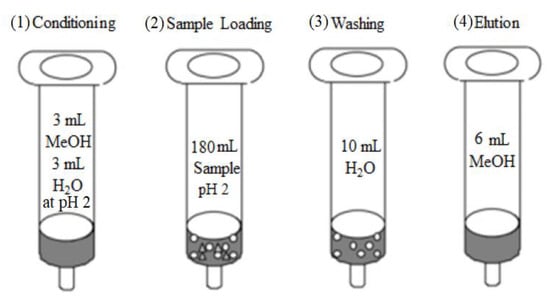 The optimization had the aims of minimizing the sample loading volume (50–200 mL) and evaluating the pH effect on the extraction, which has been previously reported in the literature [].
