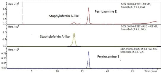 Chromatogram obtained from analysis of the standard mixture of staphyloferrin A-like compound and ferrioxamine E in TIC mode, and ionic currents extracted for staphyloferrin A-like compound ([M+H]+ 495.0) and ferrioxamine E ([M+H]+ 654.2).