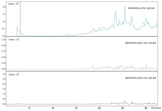 Phenomenex Jupiter 5 μm C18 300 Å 150 × 1 mm column (Torrance, CA, USA) was used for the chromatography. The flow rate was held at 50 μL/min, and the injection volume was 8 μL for both samples and standards. The mobile phase was composed of (A) 0.1% (v/v) formic acid in water and (B) 0.05% (v/v) formic acid in acetonitrile. A mobile phase consisting of a 0.1% (v/v) solution A of formic acid in water and a 0.05% (v/v) solution B of formic acid in acetonitrile was used. The programmed gradient was: 0 min: A (100%), B (0%), 5 min: A (100%), B (0%), 30 min: A (0%), B (100%), 35 min: A (0%), B (100%), 35.01 min: A (100%), B (0%). The chromatographic system was equipped with a diode array UV detector. The wavelengths (λ) used during the analysis were 220–280–320–450–650 nm.