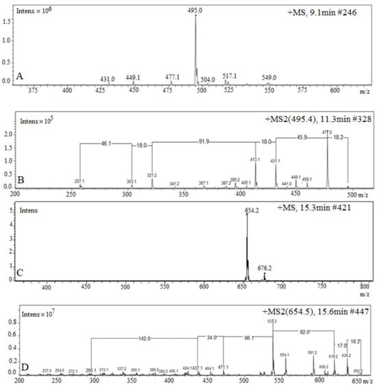 Figure 5 shows the MS spectra and MS/MS spectra of the two compounds. The concentration of both standards was 20 mg L−1, and separation was improved using the elution gradient as reported in the materials and methods section. Signal acquisition in TIC mode allowed us to assess that the chromatographic conditions used efficiently separate the two compounds.