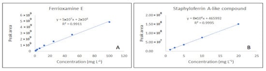 Calibration curve of ferrioxamine E (A) and staphyloferrin A-like compound (B).