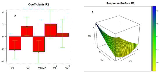A bar plot representing the coefficients of the computed model (A) and response surface for staphyloferrin A-like compound (B).