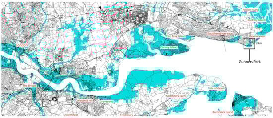 Southend-on-Sea (181,800 inhabitants) [29] is one of the most densely populated areas in south-eastern Essex (England), 64 km east of London. It is located at the estuary of the Thames River (Figure 1), and it is accessible through a transportation system, featuring several railway stations and highways. Historically, its waterfront was a significant hub for leisure and recreational activities. Currently, the city’s layout is characterized by a sprawling arrangement, mainly consisting of individual homes with gardens. Meanwhile, public, commercial and recreational services are concentrated around the main streets and along the coast. The ground levels—between 2 and 3 metres above the sea level (Ordnance Datum Newlyn)—make the city particularly vulnerable to coastal flooding. In addition, pluvial and riverine floods may occur in urban areas, mostly due to massive development processes after World War II, where many natural areas have been urbanized to provide affordable houses to the growing population, resulting in less space for water to be accommodated and drained. To date, the city faces significant pressure from property development driven by its substantial economic worth, especially along the coast [30]. Because of its critical setting, the Shoeburyness area, located in the south-eastern part of the municipality, has been identified as the main potential area for this pilot design project. Here, residential properties have been developed during the last two decades and new developments are planned to be built in the next few years despite its vulnerability to floods. Currently, Shoeburyness is protected against coastal flooding by a seawall (Figure 2), with safety standards with a return period of 100 years, pointing out the need for additional interventions to raise the level of protection of current infrastructure [31,32]. Recently, the municipality of Southend-on-Sea, together with the Association of the South Essex Local Authorities, developed a vision for the year 2050 [33], in which potential strategies, measures, policies and locations of the future developments of the region were discussed. Part of the 2050 Vision is the Essex Green Infrastructure Strategy [34] that aims at reinforcing the ecological restoration of the region to engage with the loss of biodiversity and improve the development of public spaces such as parks, gardens and sport facilities as well as cycling paths along the coastline.