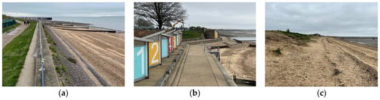 Current coastal defences in Southend-on-Sea (March 2023): (a) vertical seawall in Gunners Park; (b) concrete steps on Rampart Terrace; and (c) sand dunes in East Beach.
