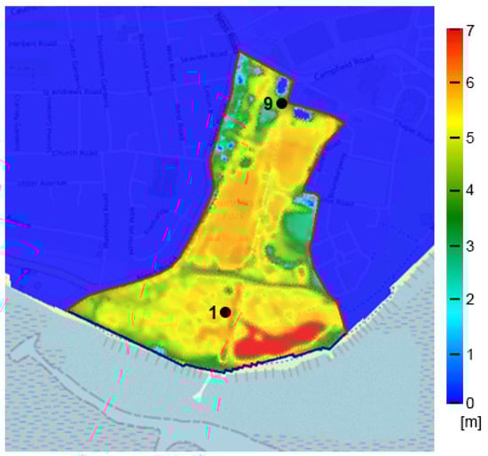 The fourth alternative is to use vegetation to reduce overtopping at the sea dike. Nature-based solutions for coastal protection is an active research topic and, therefore, no general guidelines are available yet. Here, the study by van Wesenbeeck et al. [41] was used as a reference, in which large-scale flume experiments were used to investigate the dissipation of waves by placing willow trees in front of a dike. Van Wesenbeeck et al. concluded that the willow trees reduce wave and run-up heights while hardly being damaged, even for wave heights of up to 2.5 metres. The most extreme wave conditions tested by van Wesenbeeck et al. are comparable to those determined by Wüthrich et al. [22] for Southend-on-Sea. Hence, for this study, it is assumed that placing vegetation along the coastline will dampen the incoming waves by 5%, which is slightly less than the results found by van Wesenbeeck et al. [41]. The overtopping discharge is then computed using this reduced wave height, which leads to the results of the numerical simulations presented in Figure 9b. The water levels still show values up to 6.5 m, which is higher compared to configurations with rougher revetments (e.g., rocks or steps). More specifically, the values in the most inland part of Gunners Park (3.3 m at Point 9) are still relatively high, which means that a combination of these measures is needed to optimise technical effectiveness and spatial quality and functionality.