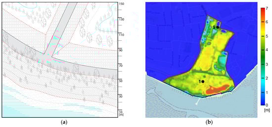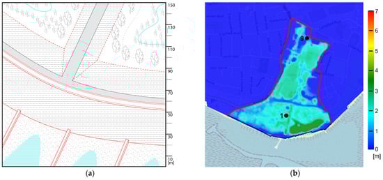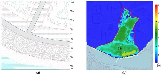 (a) Axonometric view for the scenario with stepped revetment and (b) numerical simulations (water depth map). Stored volume in Gunners Park is of 519,243 m3. Note that the red contour line represents the boundary of the domain.
