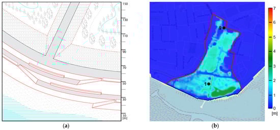 An alternative to reduce overtopping is to add rough elements (e.g., natural rocks or concrete elements) on the outer slope of the dike. Guidelines such as TAW [24] and the EurOtop Manual [25] provide roughness coefficients for different types and configurations of roughness elements on coastal dikes. For this alternative, an influence factor for roughness (γf) of 0.85 is used, which corresponds to a slope revetment with Vilvoorden stone or small concrete blocks in a chequered configuration. The results for this rocky configuration are presented in Figure 7b, showing a reduction in maximum water depths at Point 1 inside Gunners Park to 3.32 m, compared to the 4.05 m obtained with the baseline scenario. While this solution is less effective than the higher seawall (max water level at point 1 was 2.05 m), the fact that the crest of the dike is maintained at 5.04 m means that the view remains unobstructed, indicating a better connectivity between the coastal protection and the sea. The effectiveness of this solution can also be seen at Point 9, where the water depth is reduced from 2.5 m (baseline scenario) to 1.8 m.