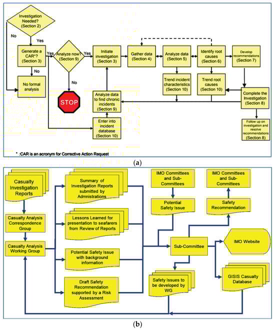 Furthermore, the classification societies IACS members [6] have also established inspection procedures related to maritime accidents. A standard methodology (Incident Investigation Model) from the American Bureau of Shipping (ABS) [7] is presented as an example of an incident inspection procedure for classification societies in Figure 1a, while the corresponding procedure by IMO is presented in Figure 1b.