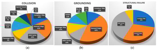 Percentages of vessel types involved in accidents due to: (a) collision for a total of 200 (100 + 100) vessels; (b) grounding for a total of 99 vessels; (c) structural failure for a total of 14 vessels.