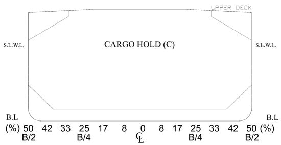 To estimate the width of the damage, a typical midship section for the specific ship type was employed, while half of the ship’s breadth was divided into 6 equal parts from C.L. to outboard (port or starboard side), i.e., per 1/12 of the whole breadth, as shown in Figure 5. With respect to the height of the external hull damage, the division was not based on the ship’s depth, but on the proximity of the damage to the vessel’s bottom (B.L.), the load waterline (max. draught) and the main deck. In cases where the damage extended above the main deck (upper watertight deck), the incident was excluded from the investigation, since it was assumed that it did not have a significant impact on the ship.