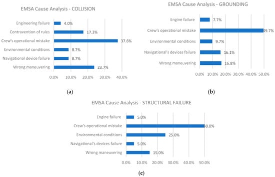 With respect to the main findings deduced, the statistical analysis results align with the existing literature, highlighting that human error (crew’s operational mistakes) is the leading cause of damage in maritime accidents in general. Additionally, a major contribution to the cause of ship collisions is rule contravention, while navigational device failure is a prominent factor in ship groundings. Furthermore, environmental conditions were responsible for a quarter of structural failure accidents, while general cargo and bulk carriers ship types were involved in the highest percentage of accidents across all three incident categories analyzed.