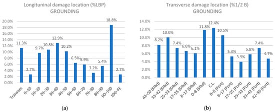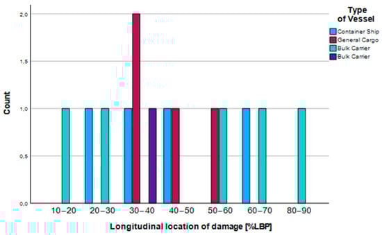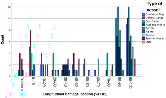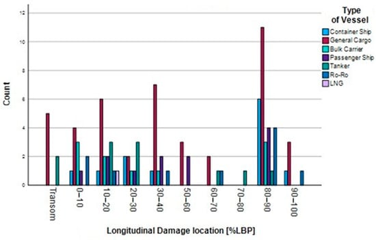 We should note that the presented statistical results in this work are concerning only the three specific types of incidents and they represent a subsample of the overall accidental events analyzed in previous research works. Therefore, it is not in the scope of this paper to evaluate the current level of safety for different vessels subtypes present in the world merchant fleet [10], nor to quantify risk in maritime transportation [11]. Moreover, previous research findings have primarily concentrated on investigating the causes of accidents, analyzing both human and organizational factors to enhance our understanding of accident causation, and developing techniques and causation models [12]. Furthermore, recent studies on ship collisions and groundings, such as the work by Kim et al. [13], focus on passenger ship response in collisions and groundings for typical accident scenarios simulated, while the research conducted by Taimuri et al. [14] assesses the extent of damage to grounded ships, and its effect on ships’ stability. Our study, however, focuses on examining the relationship between three specific types of accidental events and the resulting damage to ships, with a primary emphasis on characterizing the size and location of the damage. Additionally, we explore the correlation between key vessel factors (type, characteristics, age, etc.) and the emerged damage, providing valuable insights into the resulting consequences for vessel integrity. These findings open up new possibilities, such as the development of a real-time hull strength monitoring system with optimal sensor topology tailored to the specific type of ship, to efficiently monitor the vessel’s structural integrity and trigger alarms in response to any potential dangers arising from an accident incident.