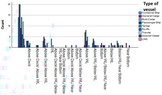 The location of the damage (for each ship after the accident) was extracted from the information provided in each of the reports issued by the appropriate authorities. We should note that in a significant portion of the investigated accidents, the affected compartments may number more than two. For that reason, we have identified all the possible combinations of the compartments that have been affected in the reviewed incidents. The transverse and bottom damage locations for the incidents were also studied.