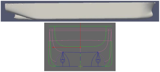 General mesh assembly used in the model-scale static drift simulations, mesh distribution on hull surface, in the y–z and x–y plane.