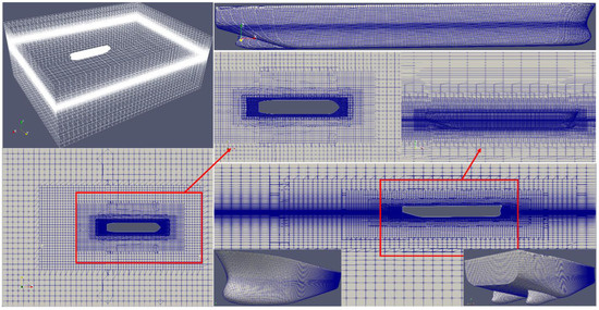 OpenFOAM mesh generation tools have been used for mesh generation. The initial simulation domain is created using blockMeshDict, with even resolution in the x and y directions and denser mesh resolution near the free surface in the vertical direction. The mesh is refined in the x–y direction using topoSetDict and refineMeshDict near the hull area. Six successive refinements are performed around the hull form to confirm the y+ criterion for capturing the boundary layer effect. For the drift simulations, the refinement areas are enlarged depending on the drift angle to accommodate the hull form. Next, snappyHexMeshDict is used to integrate the hull form into the simulation domain. The mesh resolution used for calm water simulations is around 4.0 million. The minimum cell size in the x and y directions in the mesh is 0.0125 m, and in the z direction is 0.01 m. Further, four layers have been included around the hull form with a minimum layer thickness of 0.0025 m.