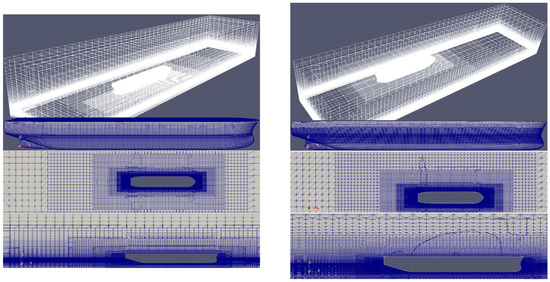 In the case of restricted water simulations, considering the model-scale ratio of 1:10, the defined class III channel dimensions were reduced by 10 times while generating the simulation domain. Mesh for the restricted channel has been created using a draft-to-depth ratio of 2 (8.7 m) and a width of 3.8 m on each side (assuming a two-way channel). In the case of one-way traffic, the assumption is that the domain is split into two, and the vessel travels through one side. The simulation domains and mesh distribution are shown in Figure 3.