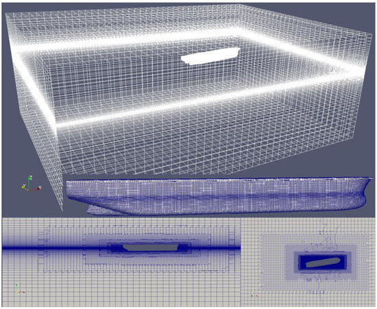 For the domain size, general ITTC (2011) [29] guidelines are used, with one-and-a-half ship length in front of the bow, two-and-a-half ship lengths behind the stern, one ship length at each side, one ship length for depth, and half ship length above the free water surface. The simulation domain and mesh distribution in x–y and y–z planes, along with mesh distribution on the hull, are shown in Figure 2.