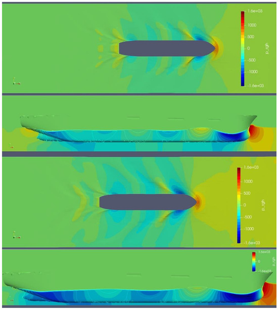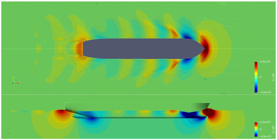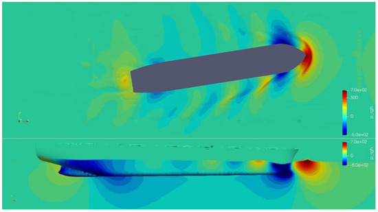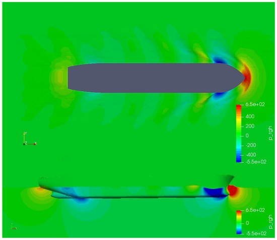 Pressure distribution on the water surface and at the side of the hull at steady condition of full-scale simulation at 10 knots speed in open waters.